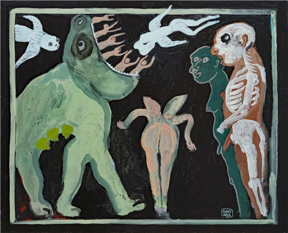 Kay Le Seelleur Ara orchestrates a joyfully strange wonderland in paint. Populated by all manner of curious creatures with dark undertones; the familiar and the strange, the diabolic and the angelic, her images are at once hilarious and tragic.